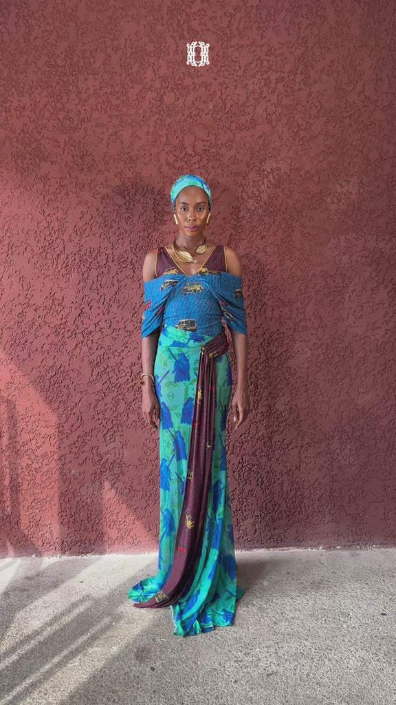 A bold, contemporary silhouette featuring an under-bust diagonal cut that shapes a flattering V-neckline. Firm side-drape sleeves extend gracefully from the cut line, adding sculptural elegance to the bodice. The asymmetric skirt is designed with fitted precision at the hips, flowing into soft draped movement, while a shawl-like extension from the waist creates a fluid, dramatic finish. Striking, modern, and effortlessly refined , a look made to command attention.