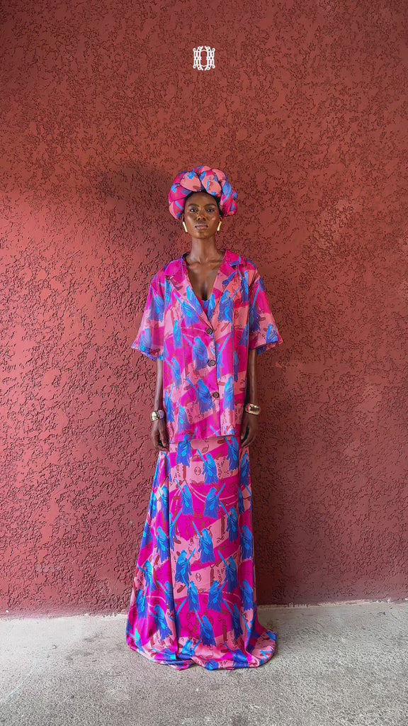 A contemporary two-piece set that blends fluidity with structure. The look features an oversized sheer organza shirt layered effortlessly over a luxurious silk slip dress printed in our signature Eyo Masquerade pattern. The slip dress is fully lined for a smooth, elegant finish, offering refined ease that transitions seamlessly from day to night.